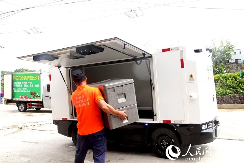 在贵阳家旺兴食品有限公司,搬运人员正在给无人配送车装货。人民网记者 王秀芳摄